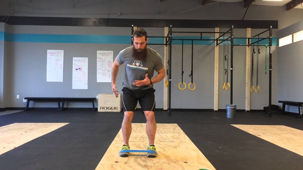 Place the band around both ankles, making sure the band is not bunched and around both legs. Put your feet shoulder-width apart, with the band taut not stretched. Bend your knees slightly into a semi-squat, shift your weight onto one leg, and take a sideways step with the other leg.
